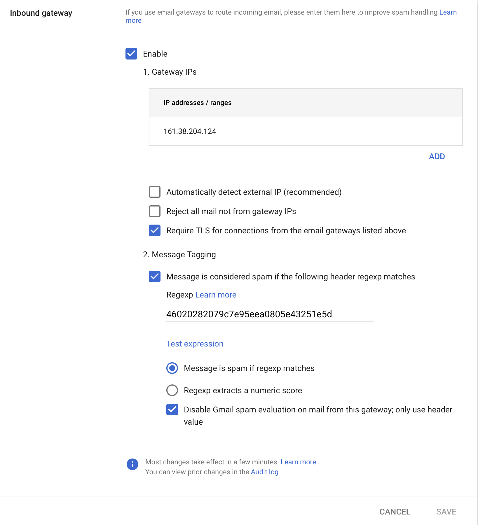 10. Disable `Gmail spam evaluation on mail from this gateway; only use header value`