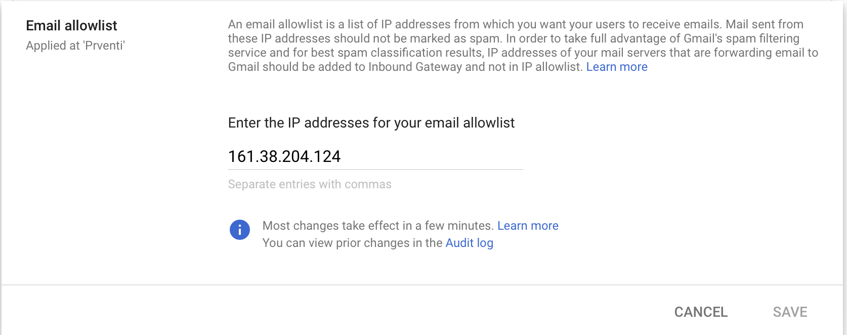 4. Edit the Email allowlist and add the Prventi IP addresses below and Save
